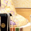 菊の花を繊細なタッチで描いた衝立屏風の中央部分は、伝統的工芸品でもある美濃和紙仕立て。180度回転させることが可能で、裏側は金塗の屏風になっており、1枚の屏風で2通りの飾り方をお楽しみいただけます。