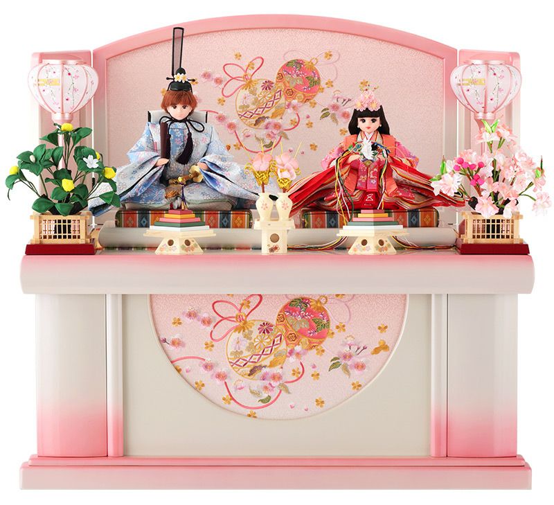 可愛らしいピンクのグラデーションが目を惹く飾り台と屏風には、縁起の良い毬と桜の刺繍が施され、春のお節句に相応しい仕上がりです。