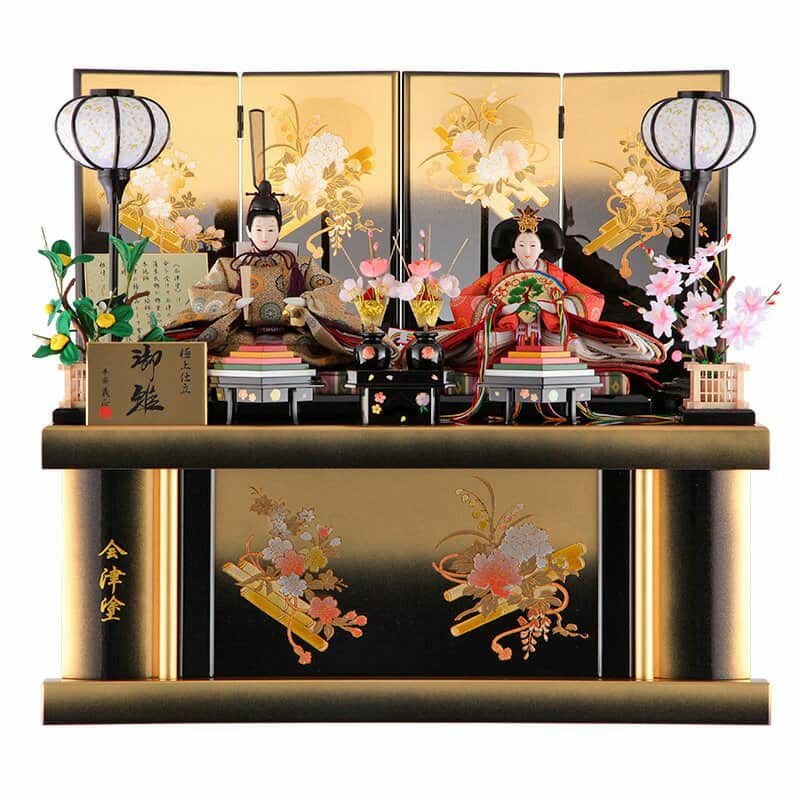黒と金のボカシが煌びやかな会津塗の台屏風に、上品な衣裳を着せ付けたお人形を合わせたお雛様です。