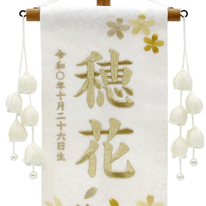 風合い豊かな地紋に大小様々な桜が舞う、総刺繍仕立ての上質な名前旗です。