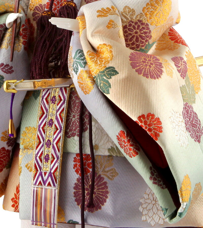 優美な佇まいのお人形には、京都西陣織の雅やかな衣裳を着せ付けました。