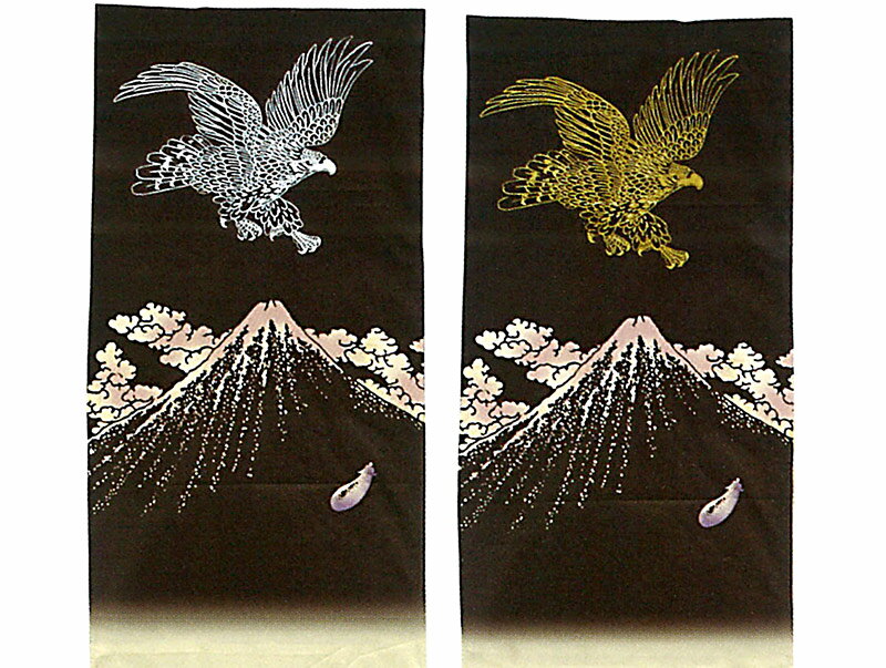 シックな生成の生地に、縁起の良い一富士二鷹三茄子と立身出世に願いを込めた龍の絵柄を描きました。