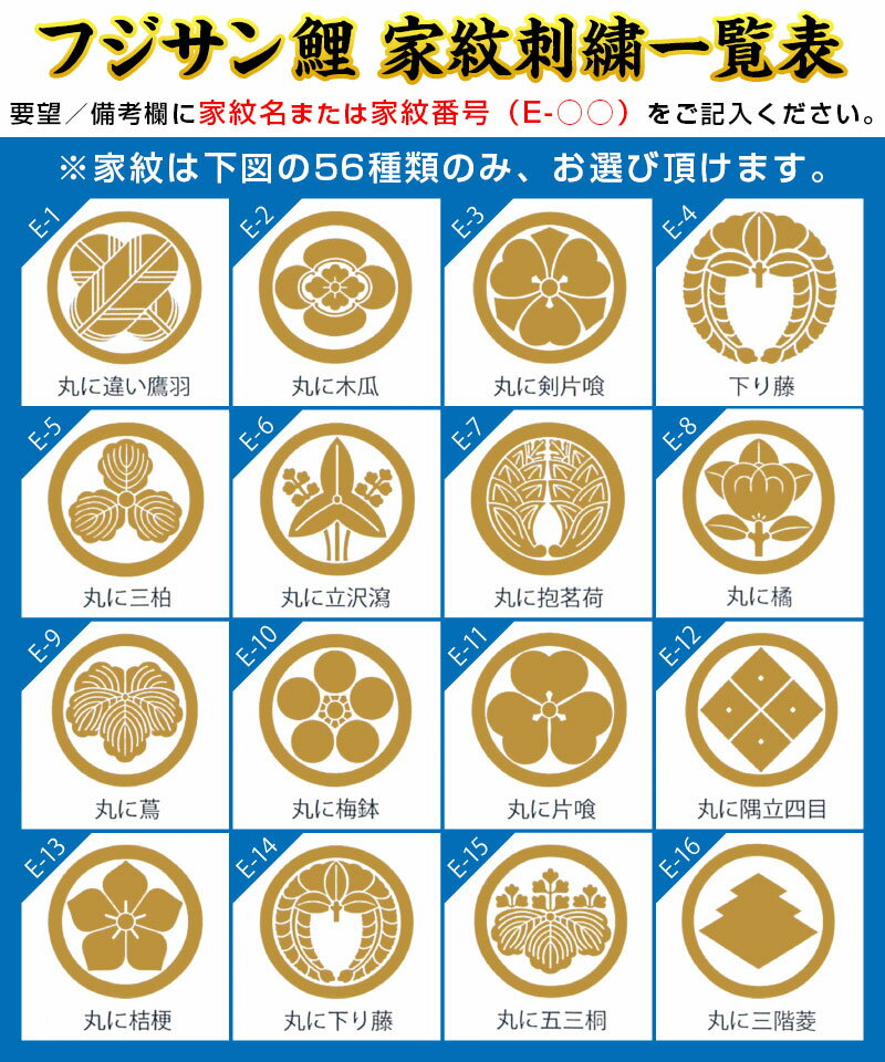 家紋は「フジサン鯉金家紋刺繍一覧表」にある56種類のみの対応となります。