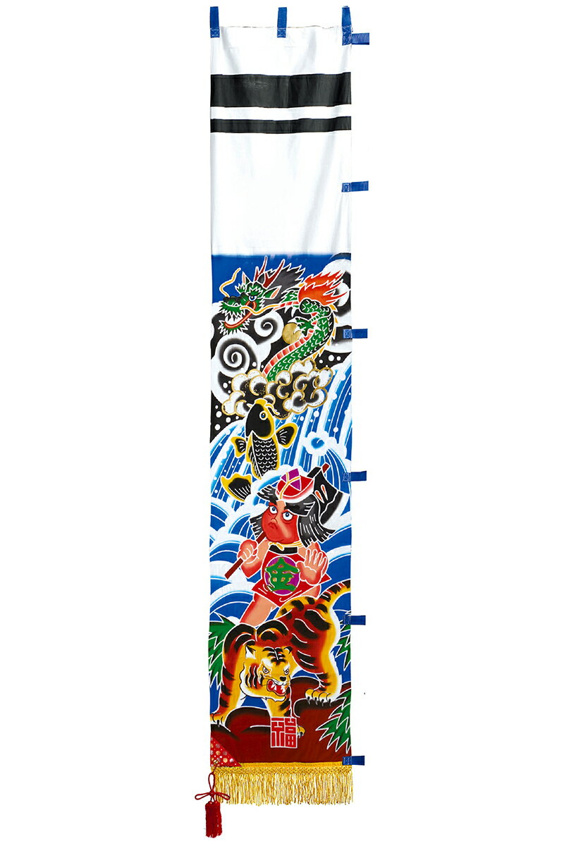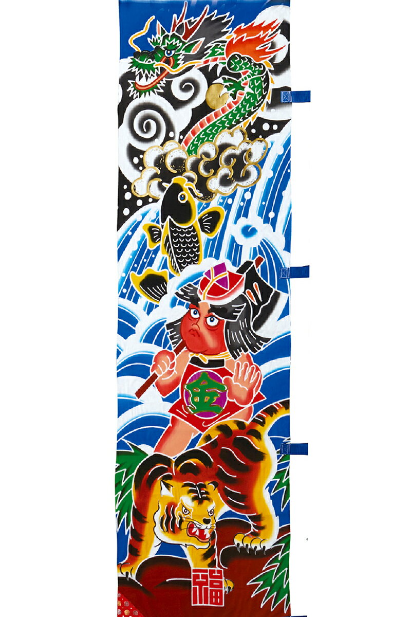 金太郎は長じて大江山の酒呑童子を退治した坂田公時の幼名。鯉が滝を昇り龍になったという立身出世の図柄に元気いっぱいの金太郎と虎を組み合わせ、男児が雄々しく成長する願いを託した幟です。