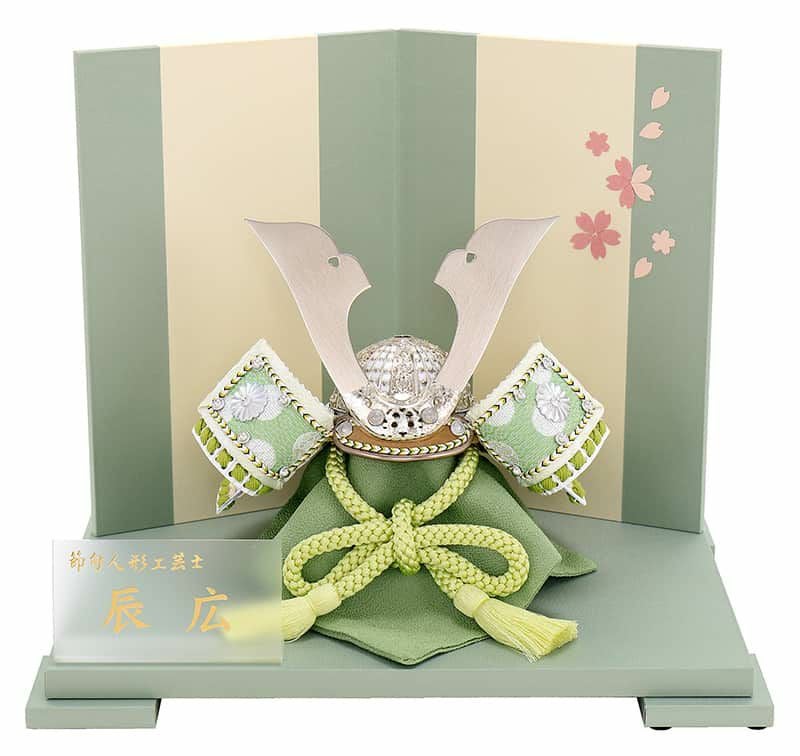 甲冑師辰広作の爽やかな色合いが魅力の兜飾りです。