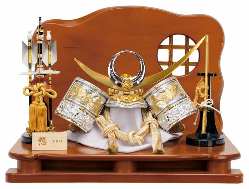 重厚感のある木目の衝立飾台に、華やかな兜をセットした、コンパクトながら飾り応えのある一式です。