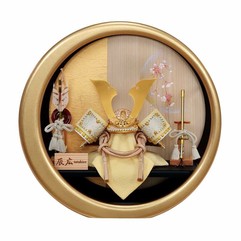 タモ材を使用した円形の飾り台は、月をイメージして金色に塗りあげ、華やかな兜の存在感を一層惹きたてています。