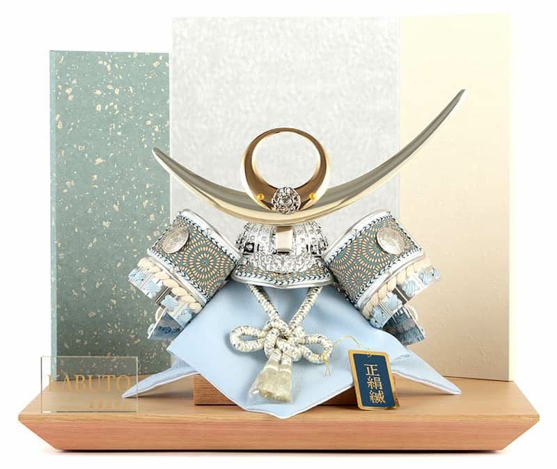 シルバーを基調に仕立てたスタイリッシュな兜には、上杉兜の特徴でもある日輪に三日月前立てがきらりと輝きます。