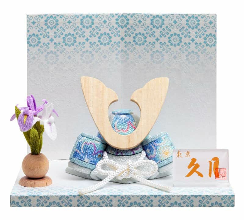 爽やかな水色を基調とした兜は、溝に布地を押し込んで製作する木目込仕立て。丸みを帯びたフォルムが、なんとも愛らしいですね。