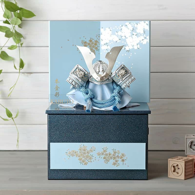 宝童監修「白銀水色中鍬兜」5号収納飾りです。