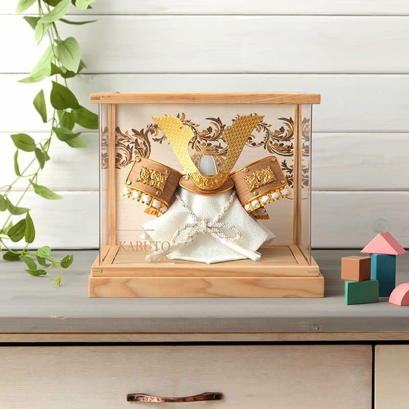 宝童監修「金茶中鍬兜」5号ケース飾りです。