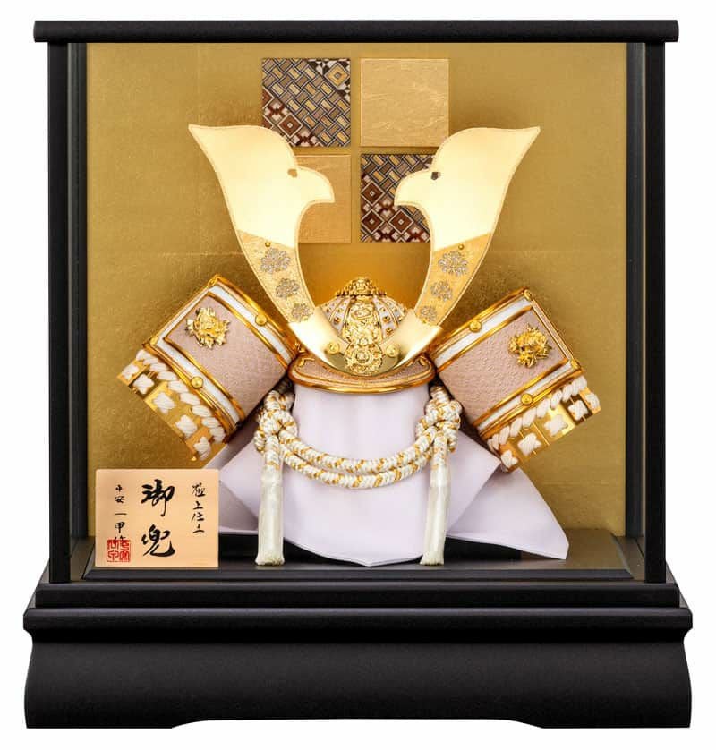 艶をおさえた黒枠に金背景を合わせた伝統的なケースに、白と金を基調としたモダンな風合いの兜を合わせました。
