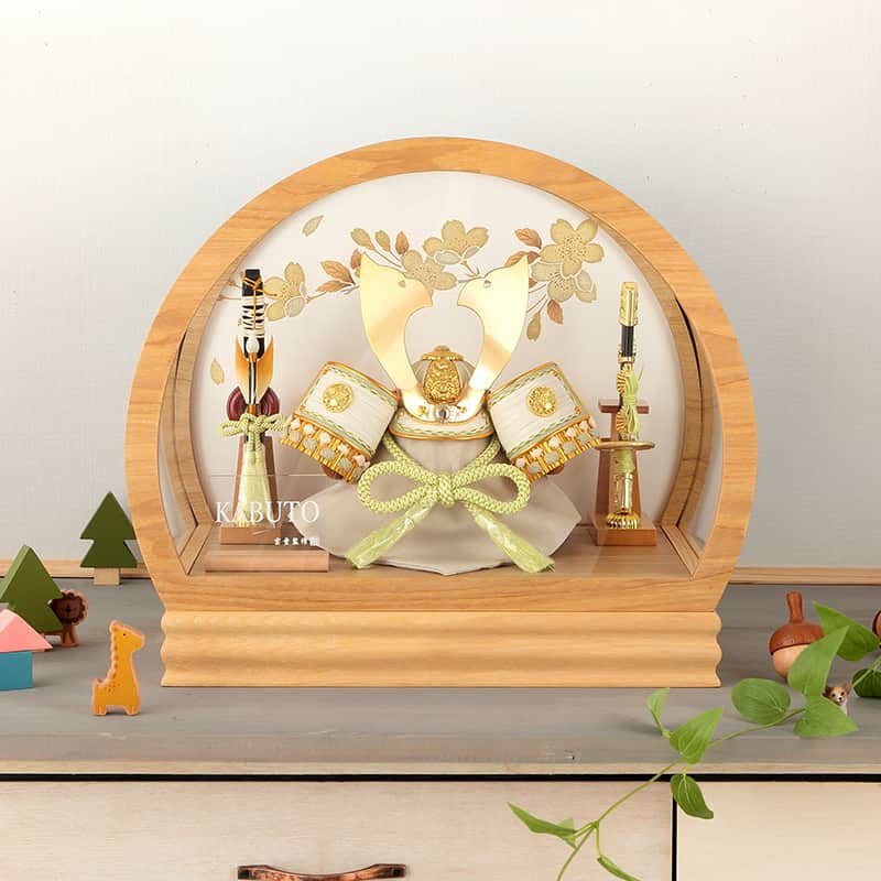 半円形のおしゃれなアクリルケースに、淡いグリーンを基調としたさわやかな兜を合わせました。