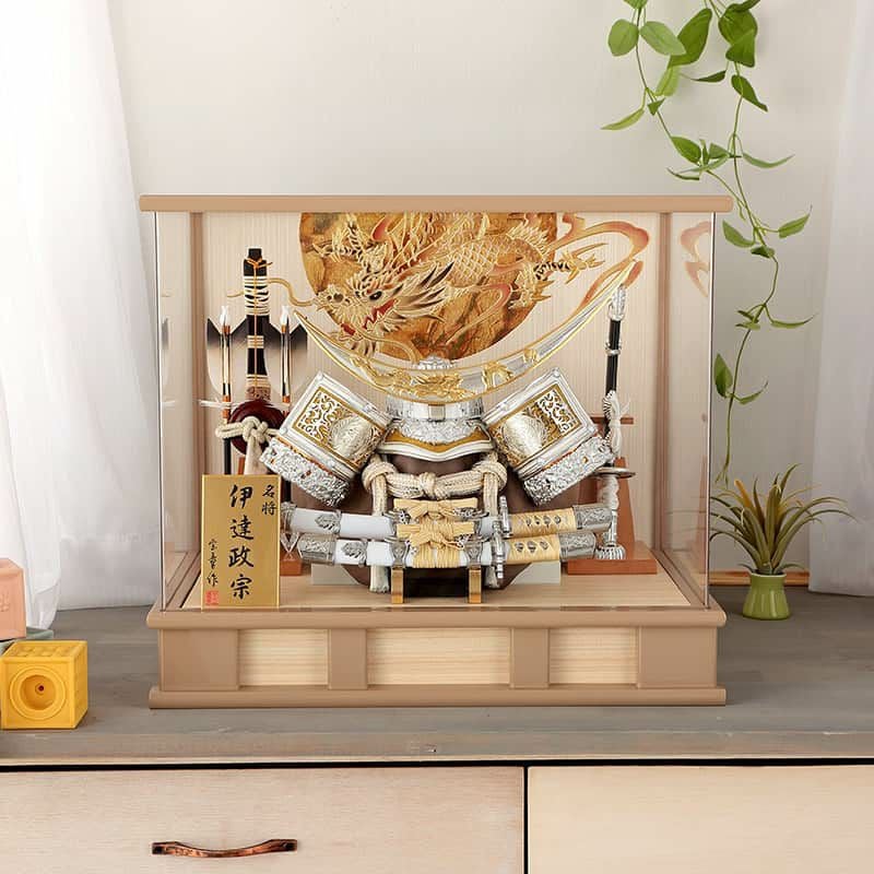 ベージュトーンの落ち着きあるケースに、白銀のきらびやかな兜が存在感を放ちます。