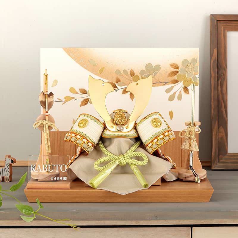 近年トレンドの淡い色調の兜を、コンパクトサイズで仕立てました。グリーンを基調とした爽やかな兜には、ゴールドの金具がよく合いますね。