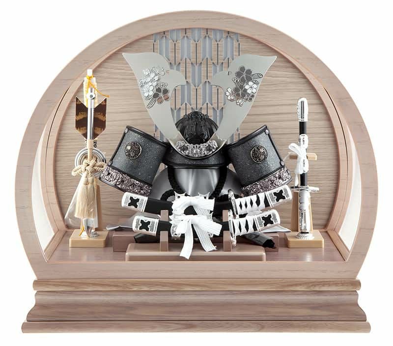木目が美しい丸型ケースに、黒とシルバーを基調とした重厚感のある兜を配しました。