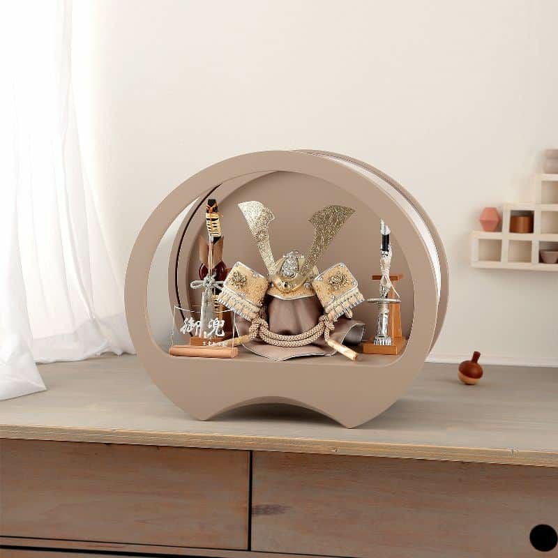 円満の意味を込めた円型のアクリルケースに、ナチュラルカラーを基調に仕立てた兜をあわせました。