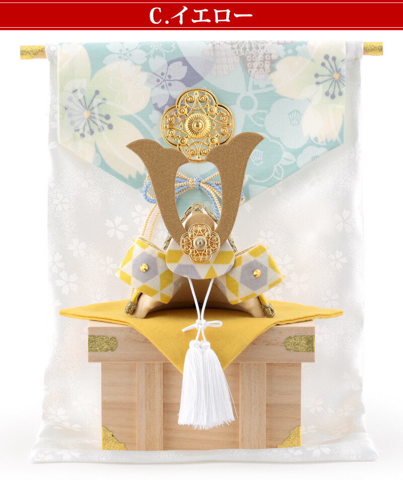 風合い豊かな布細工で仕立てた、手のひらサイズのコンパクトな兜飾りを、白木のシンプルな飾り台に乗せ、バックには几帳(きちょう)を合わせています。