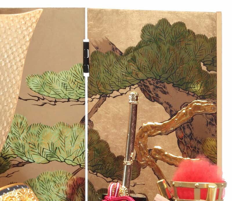 飾台と屏風には、長寿の象徴として縁起の良い松が描かれています。