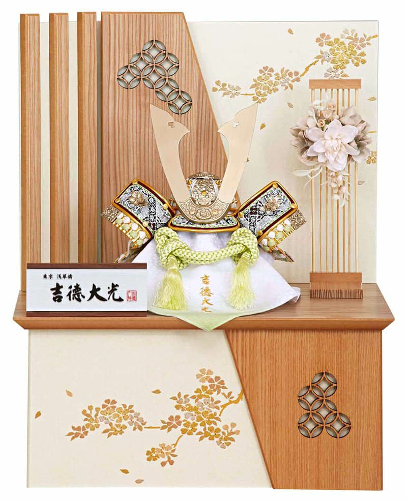 飾り台と屏風はナチュラルテイストに仕立てられ、品よく描かれた桜の金彩絵もおめでたい雰囲気を引き立てます。また屏風にはLEDライトがセットされており、明かりを灯せば春の木漏れ日のような光が兜を優しく照らします。
