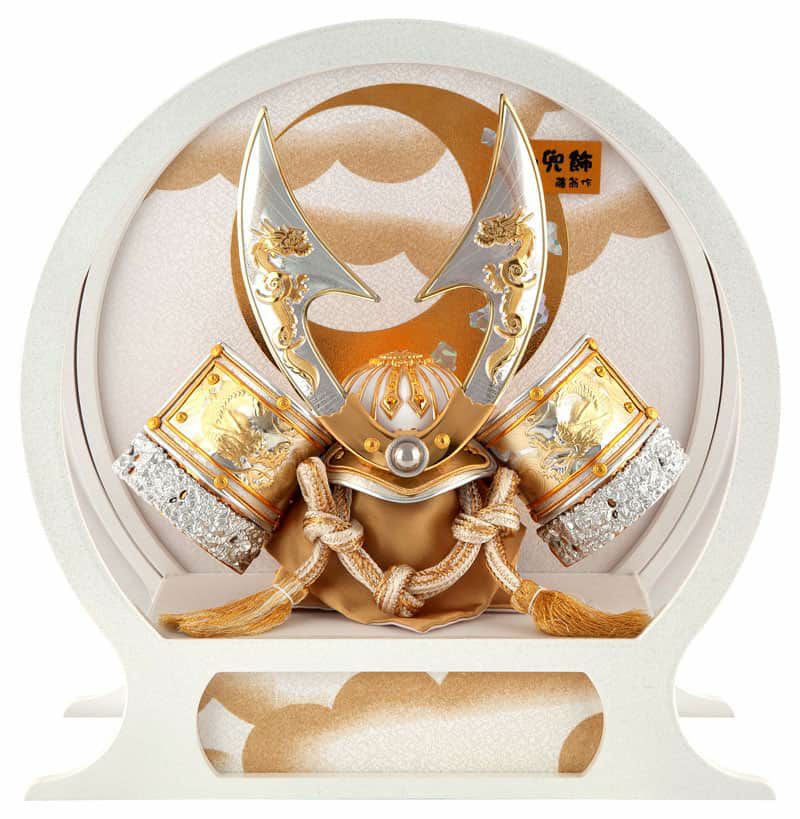白と金を基調に仕立てた兜には、盛上龍の装飾があしらわれた力強い鍬形が輝き、背景に描かれた涼やかな夏の月夜もおめでたい雰囲気を引き立てています。袱紗や忍び緒、ケースの彩色にいたるまで統一された色使いで仕立てられており、デザイン性の高い仕上がりです。