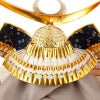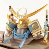 白と金色を基調に仕立てたスタイリッシュな兜には、魔除けや立身出世の象徴ともいわれる龍をあしらった、日輪三日月前立てが輝きます。