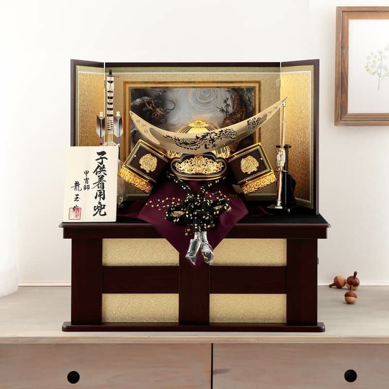 木目を活かした暖かみのある飾り台は、収納箱となりますので、兜などをしまい屏風を上に置くことで省スペースにお片付けでき、オフシーズンにも便利です。