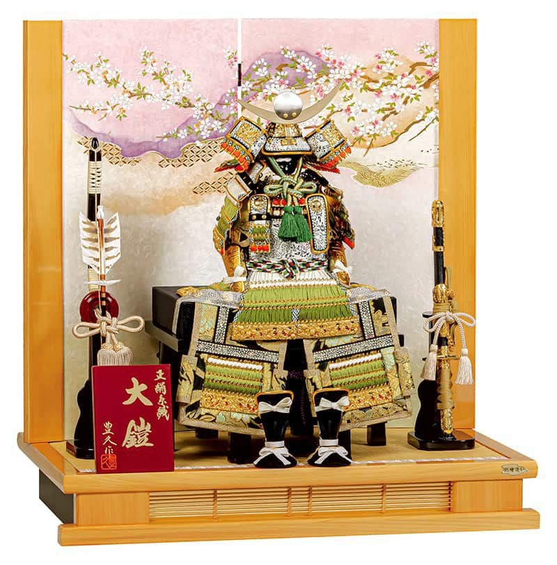新緑を思わせる色合いの鎧と、自然の風合いあふれる総檜造りの台屏風が見事に調和しています。