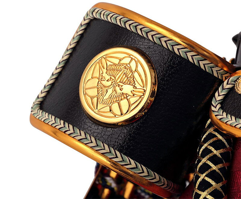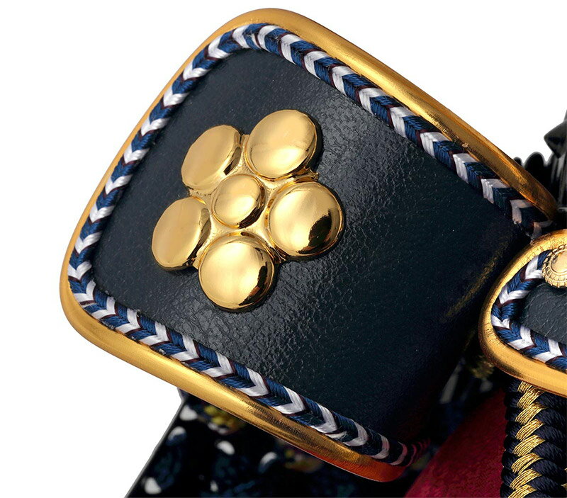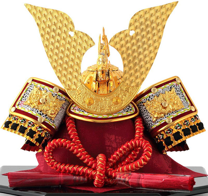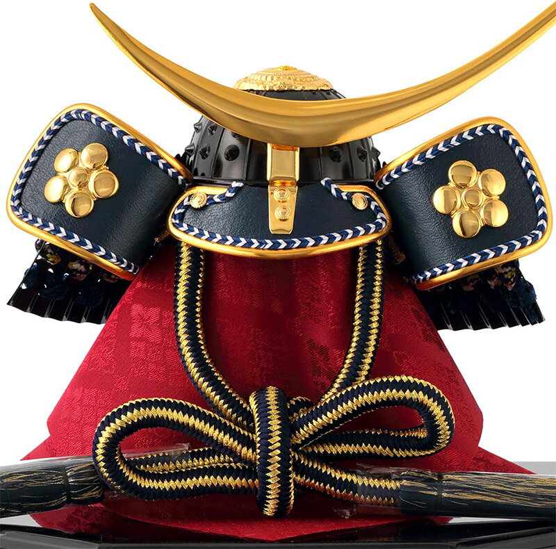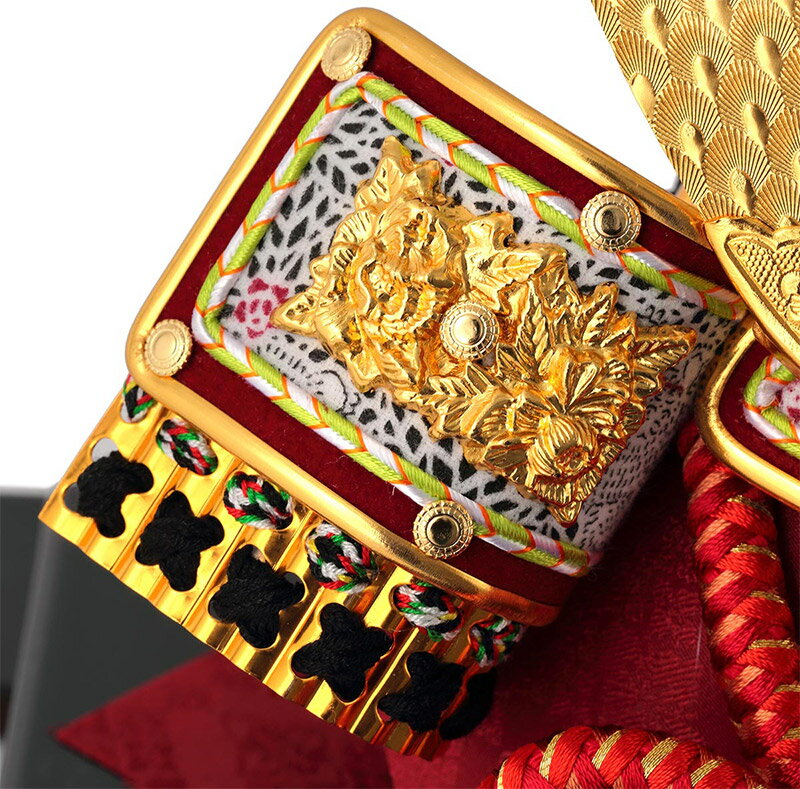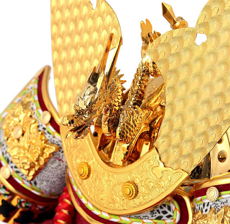 存在感のある龍頭や鍬形、赤を基調とした忍び緒など、煌びやかな印象の兜飾りです。