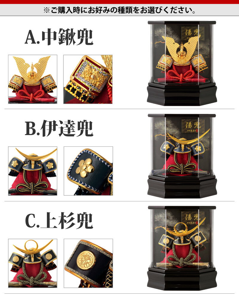 ご購入の際は、A.中鍬兜 B.伊達兜 C.上杉兜よりご希望の商品を一つお選びください。