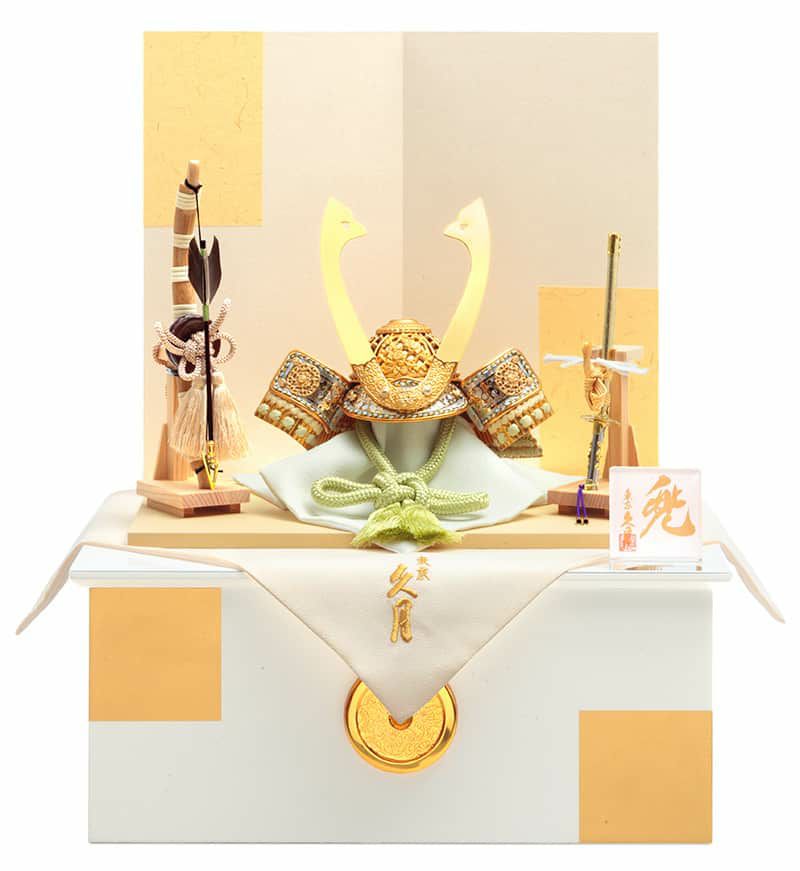 白を基調として明るい色目で統一した飾台と屏風で、現代的なお部屋に調和しつつも、華やかな彩を加える兜飾りです。