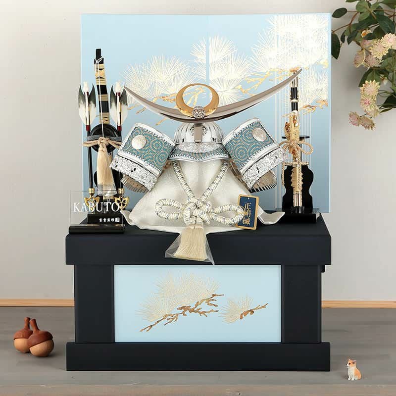 宝童監修「白銀水色上杉兜」12号収納飾りです。