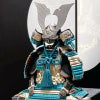 重厚感のある燻し銀の鍬形や金物細工と対称的に、目の覚めるようなブルーの威し糸が印象的なこちらの鎧飾り。