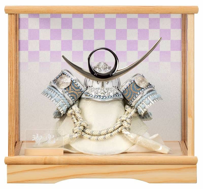 白とシルバーを基調にまとめた兜はモダンな仕上がりで、和洋問わずお部屋の雰囲気に良くなじむことでしょう。