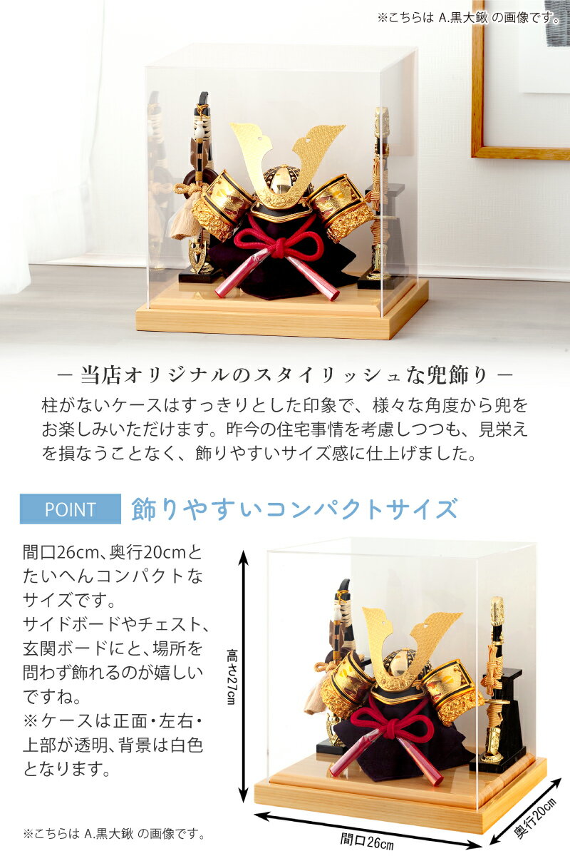 オリジナルの柱のないスタイリッシュなアクリルケースが目をひく兜飾りです。