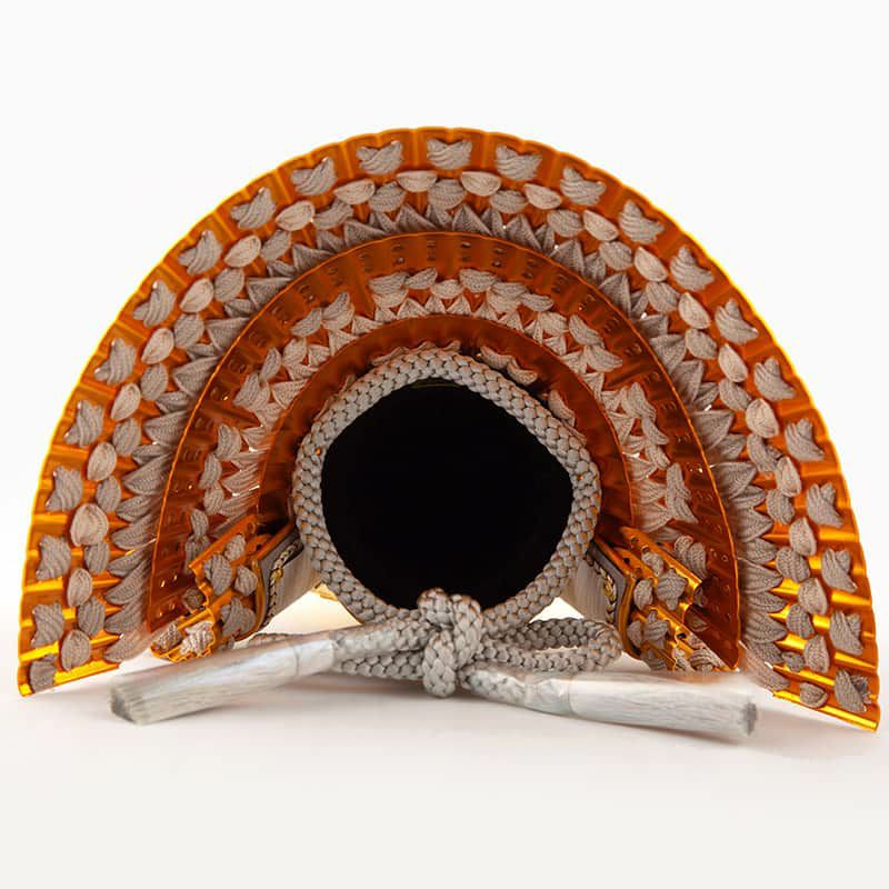 徳川兜の特徴、獅子噛に歯朶の葉の前立てに、吹返しにも徳川家の家紋「葵紋」をあしらいました。天下人の家康にあやかって、元気で大きく育ちますようにという願いが込められています。