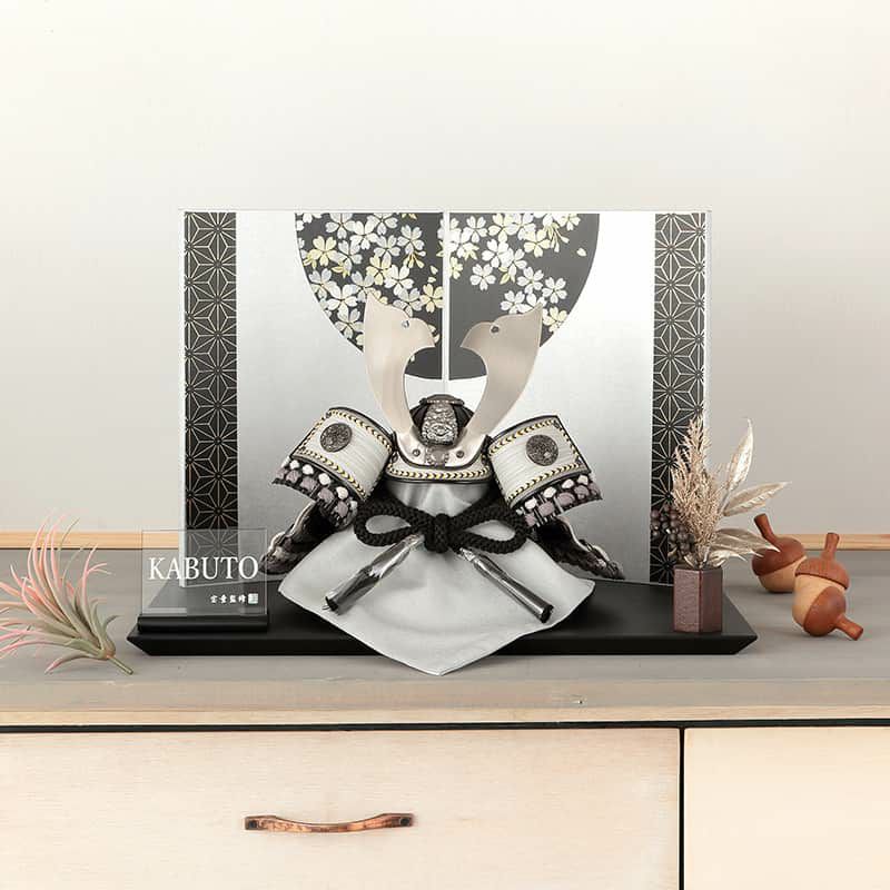 全体をモノトーンの色調で統一した、スタイリッシュな兜飾りです。