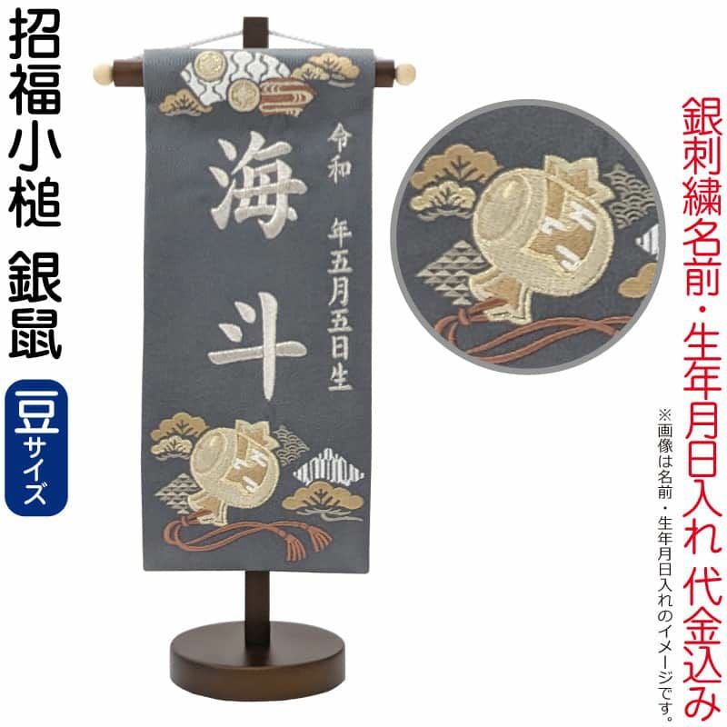 【送料無料】最安値に挑戦!2026年度新作 五月人形 五月人形 名前旗 男の子 招福小槌 銀鼠(豆)銀刺繍 生年月日 名前入れ代金込み スタンド付 【2026年度新作】 5ad-sfkz-gn