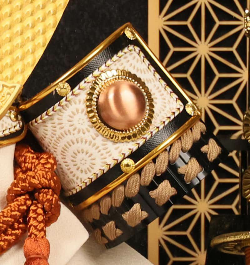 兜の左右には魔を祓うとされる弓太刀飾りをセットし、マンションなどでもお飾りいただけるコンパクトサイズのケース飾りに仕上がりました。