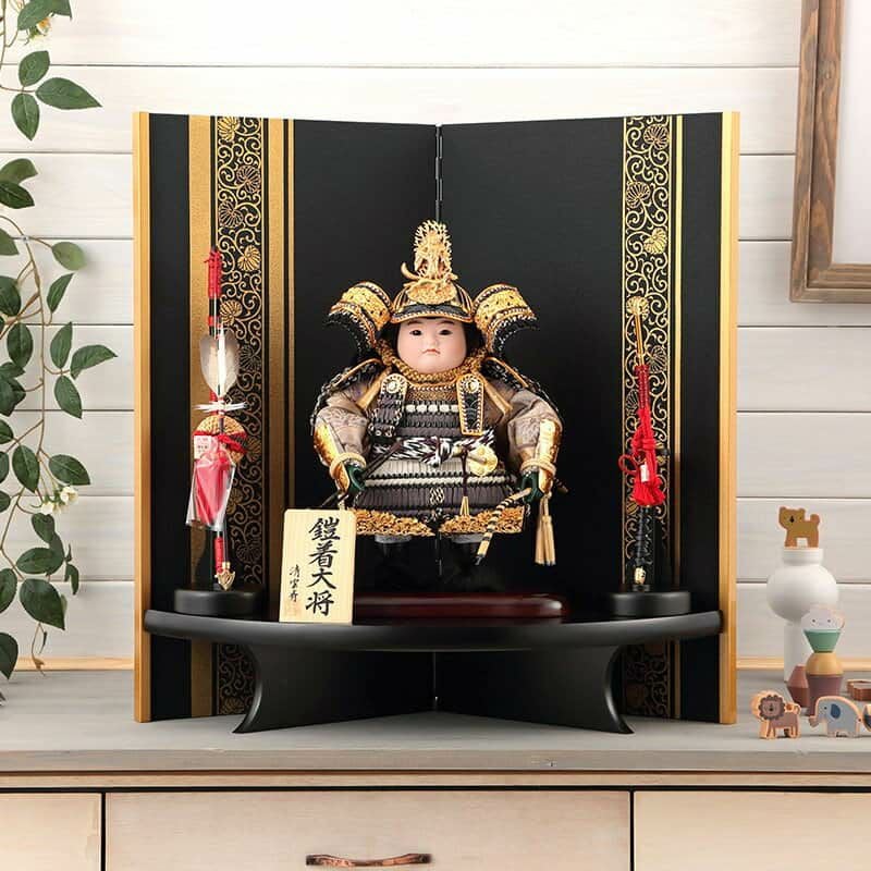 背の高い屏風にお人形をセットした、子供大将飾りです。
