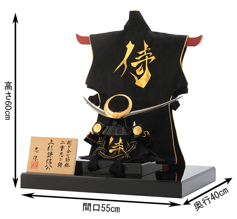 日輪に三日月前立の上杉兜に、背中に大きく「侍」の一文字を入れた、陣羽織をバックにセットしております。