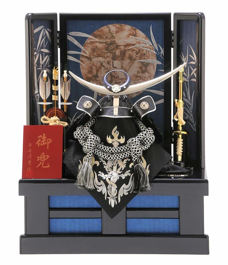 【送料無料】最安値に挑戦!2026年度新作 五月人形 五月人形 端午の節句 兜飾り 兜収納飾り 平安清秀作 紺塗 上杉兜 12号 色彩箔盛上銀 月に竹 【2026年度新作】 h265-mien-n-usg