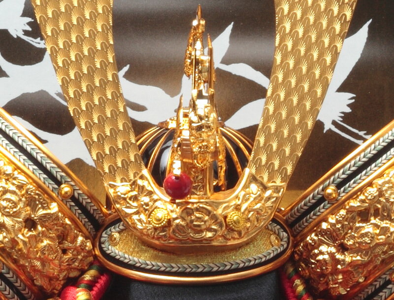 鳥毛模様を打出した鍬形が輝く兜飾りには、鍬形台や吹返しなど細かな装飾が煌びやかな印象です。