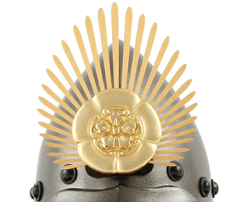 南蛮胴具足の兜をできる限り再現した逸品で、鉢は2枚の鉄板を打出して作られた桃形兜(ももなりかぶと)、前立てに織田木瓜が輝きます。