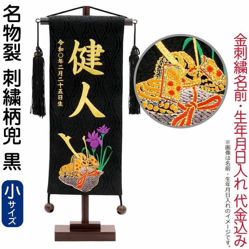 【送料無料】最安値に挑戦!2026年度新作 五月人形 五月人形 こいのぼり 名前旗 村上鯉 室内飾り 名物裂(小)刺繍柄兜 黒 黒房 スタンド付 金糸刺繍 生年月日 名前入れ代込 【2026年度新作】 mk-name5-161-175