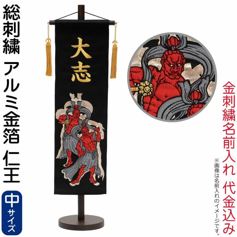 阿吽の呼吸で知られる守護神の仁王を刺繍で描き、キラキラと輝くアルミ金箔をあしらいました。
