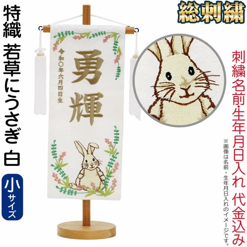 【送料無料】最安値に挑戦!2026年度新作 五月人形 五月人形 こいのぼり 名前旗 村上鯉 室内飾り 特織(小)若草にうさぎ 白 白房 スタンド付 薄茶糸刺繍 生年月日 名前入れ代込 【2026年度新作】 mk-name5-653-939