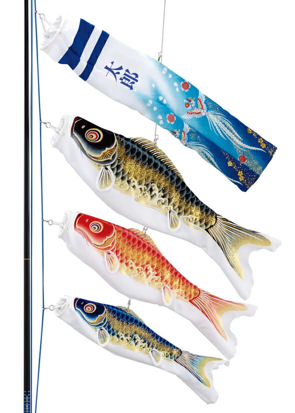 セット内容:吹流し70cm 黒鯉70cm 赤鯉60cm 青鯉50cm (株)グラファイトデザイン社製カーボンポール1.5m 家具調高級スタンド 木製金箔玉 高さ:180cm