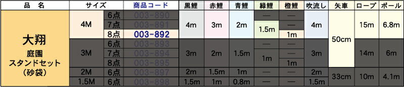 ポール全長:6.8m 7本継 スタンド設置面:1100×900mm セット内容:黒鯉4m 赤鯉3m 青鯉2m 緑鯉1.5m 橙鯉1m 吹流し4m 矢車(矢羽根直径)50cm ロープ15m ポール6.8m スタンド 砂袋