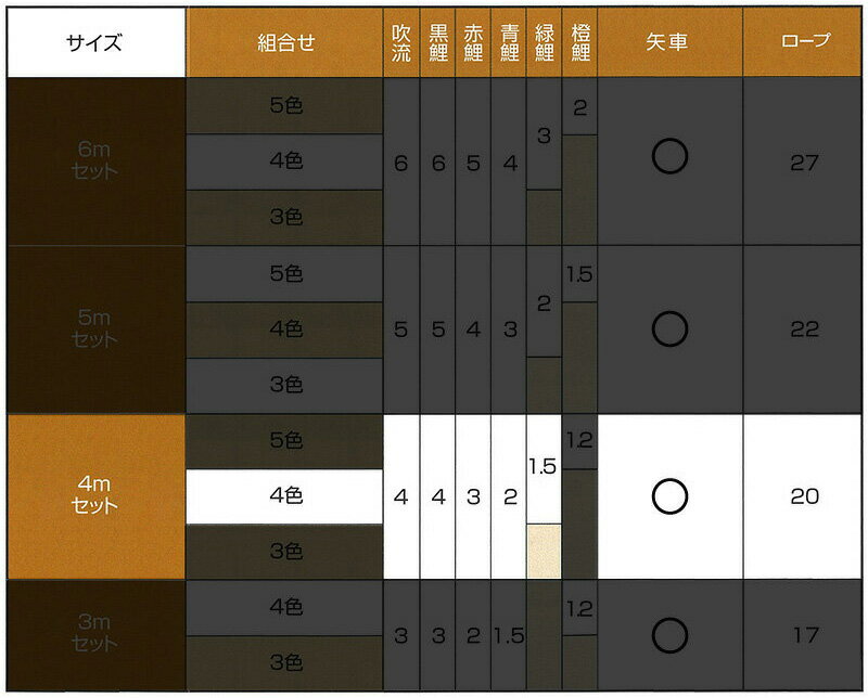 セット内容:吹流し4m 黒鯉4m 赤鯉3m 青鯉2m 緑鯉1.5m 矢車0.55m ロープ20m
